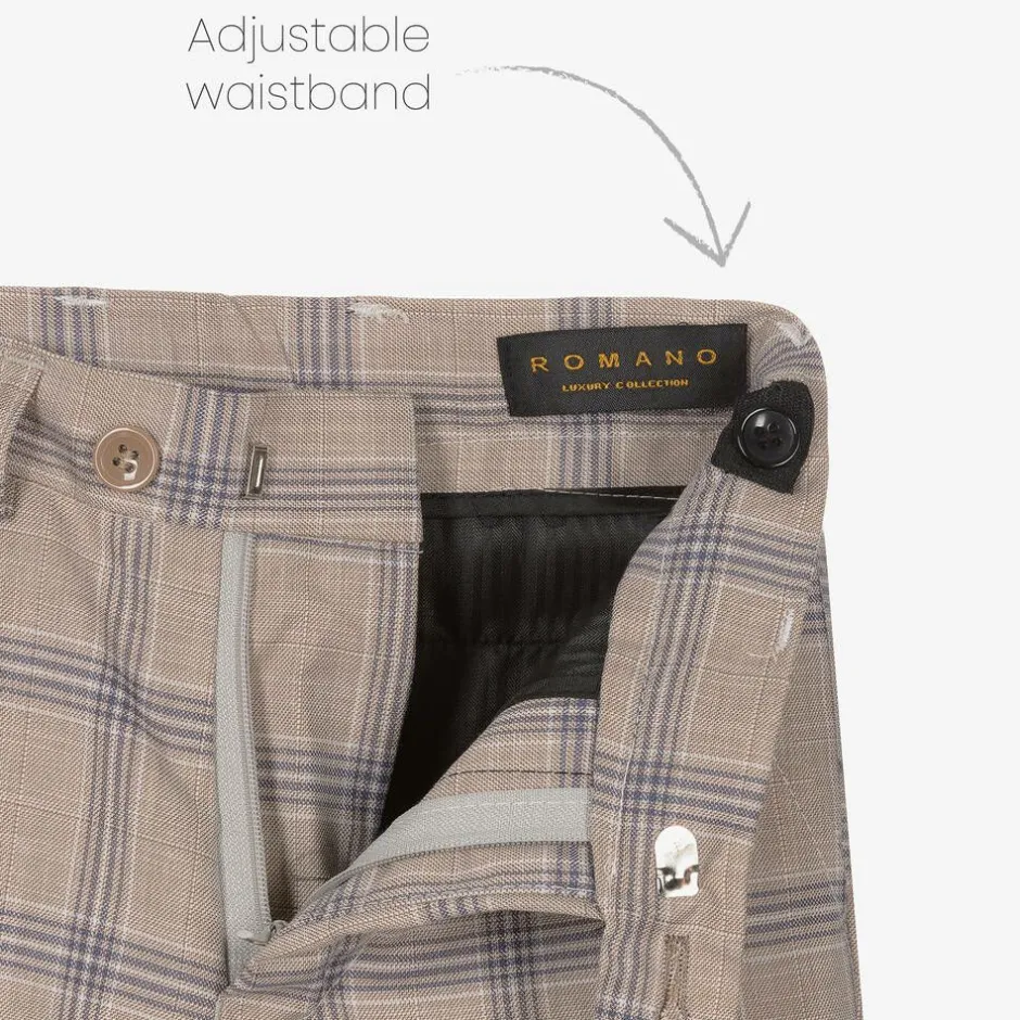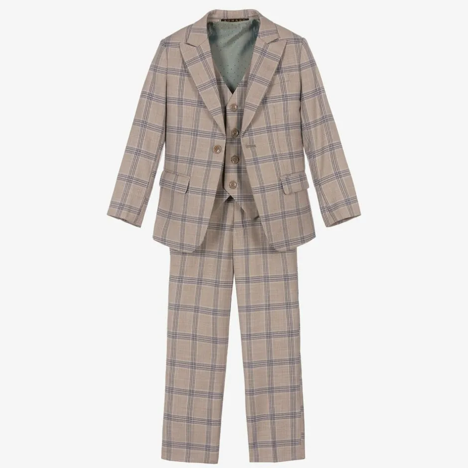 In a beige and blue check, this hand-tailored suit for boys is by British brand Romano. Suitable for a formal occasion, this smart suit comprises a blazer jacket, trousers and waistcoat. Super comfortable to wear, it woven in a soft viscose blend and lined in silky satin for a luxurious feel. The jacket is vented at the back for ease of movement and the trousers have an adjustable waist for an ideal fit.
