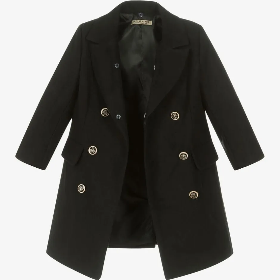 Smart black coat for boys by British brand Romano. It has a revere collar with an eye-catching, removable, black faux fur trim and black enamelled crest button fastenings with shiny silver detailing. Made in super soft, peached, mid-weight fabric, the coat has front flap pockets and a satin lining. There are faux buttons on the cuffs.