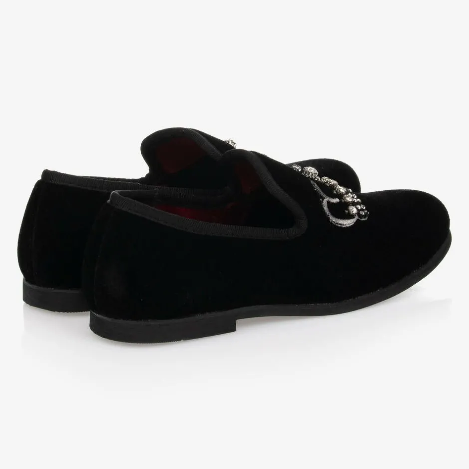 Sophisticated black slip-on shoes for boys by Romano, made from soft velvet. There are silver embroidered crowns on the toes decorated with sparkling diamanté embellishments, for an elegant look. Lined in smooth burgundy red satin with quilted insoles, they have smart non-slip rubber outsoles.