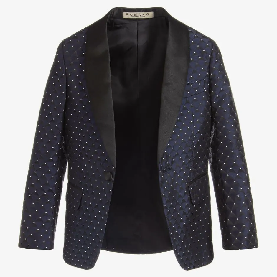 Boys special occasion suit by Romano. It has a patterned blue satin jacket and waistcoat, with plain black trousers. The waistcoat can be adjusted on the back and the trousers have piped satin side seams and an elasticated waistband.
