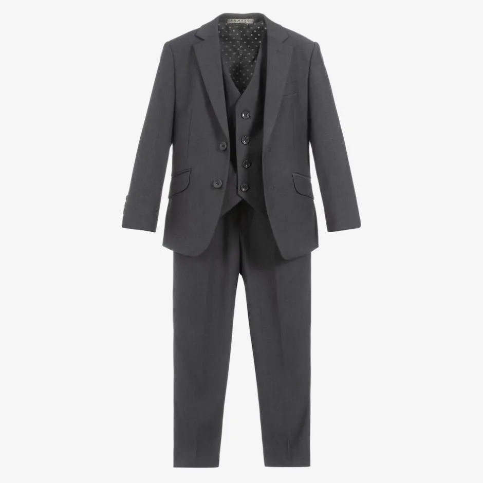 An elegant three piece grey suit for boys by Romano. Made from a soft, mid-weight viscose blend, the smart waistcoat gives a smart look to accompany the trousers and jacket. For a comfortable fit, the trousers have an elasticated waist on the smaller sizes and an adjustable waist on the larger sizes. The wide age range available makes it perfect for pageboys.
