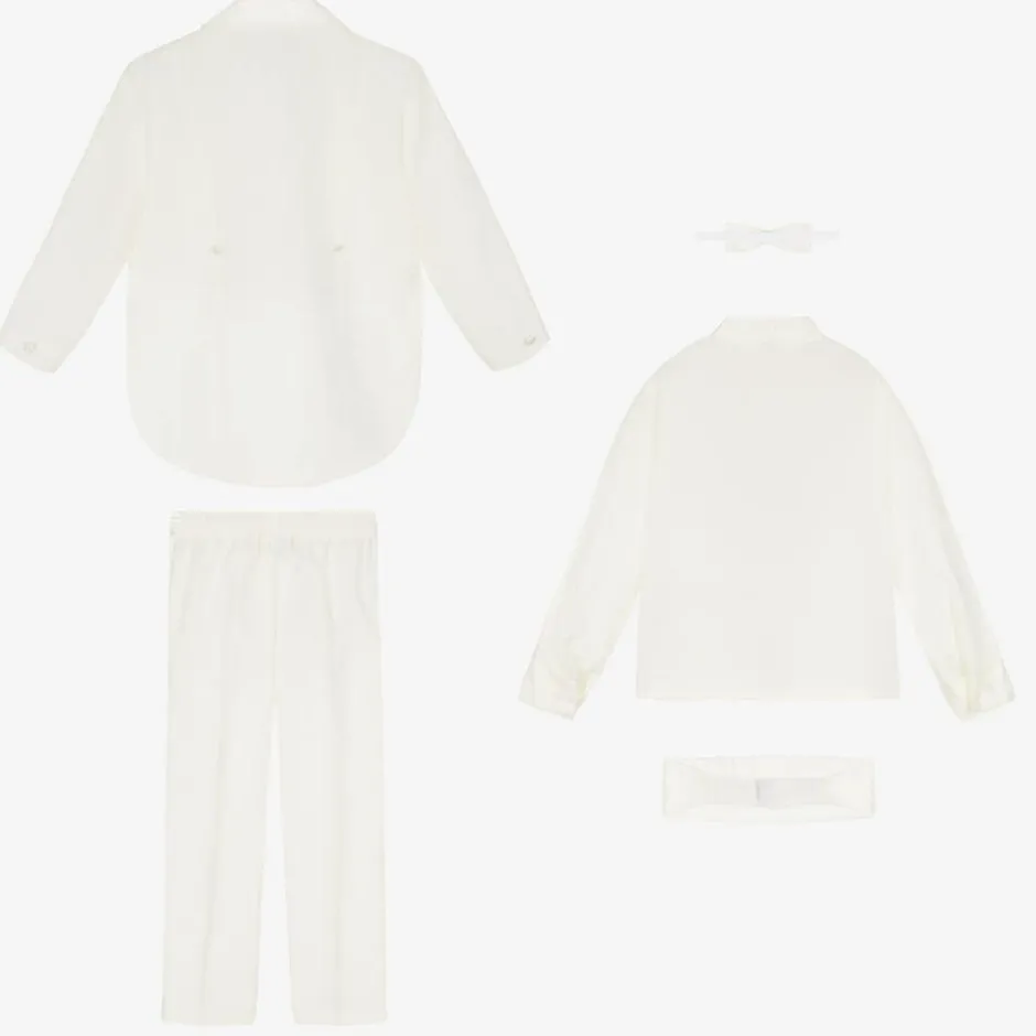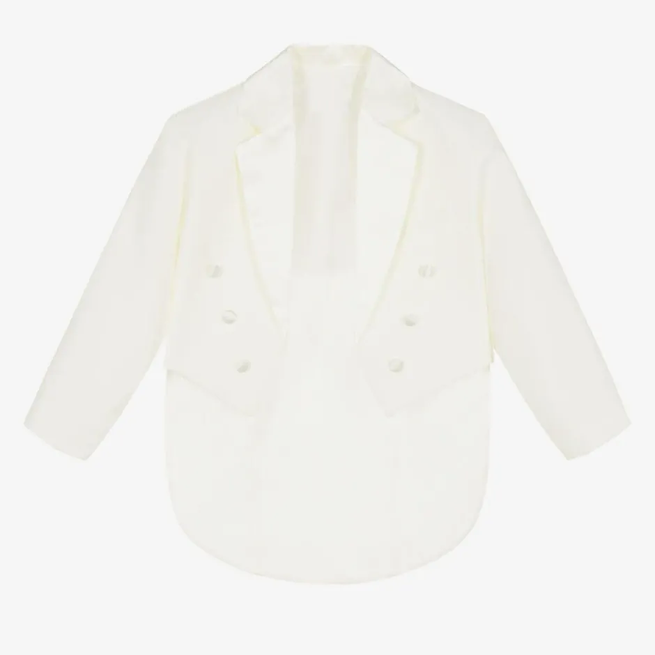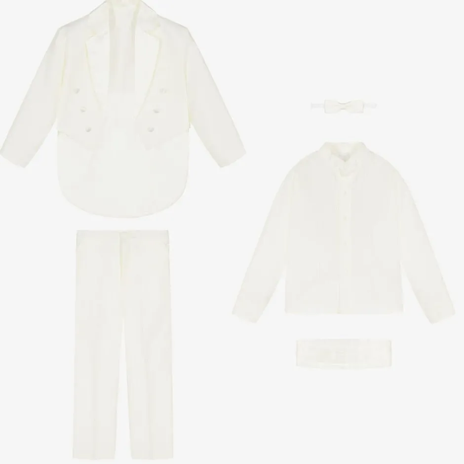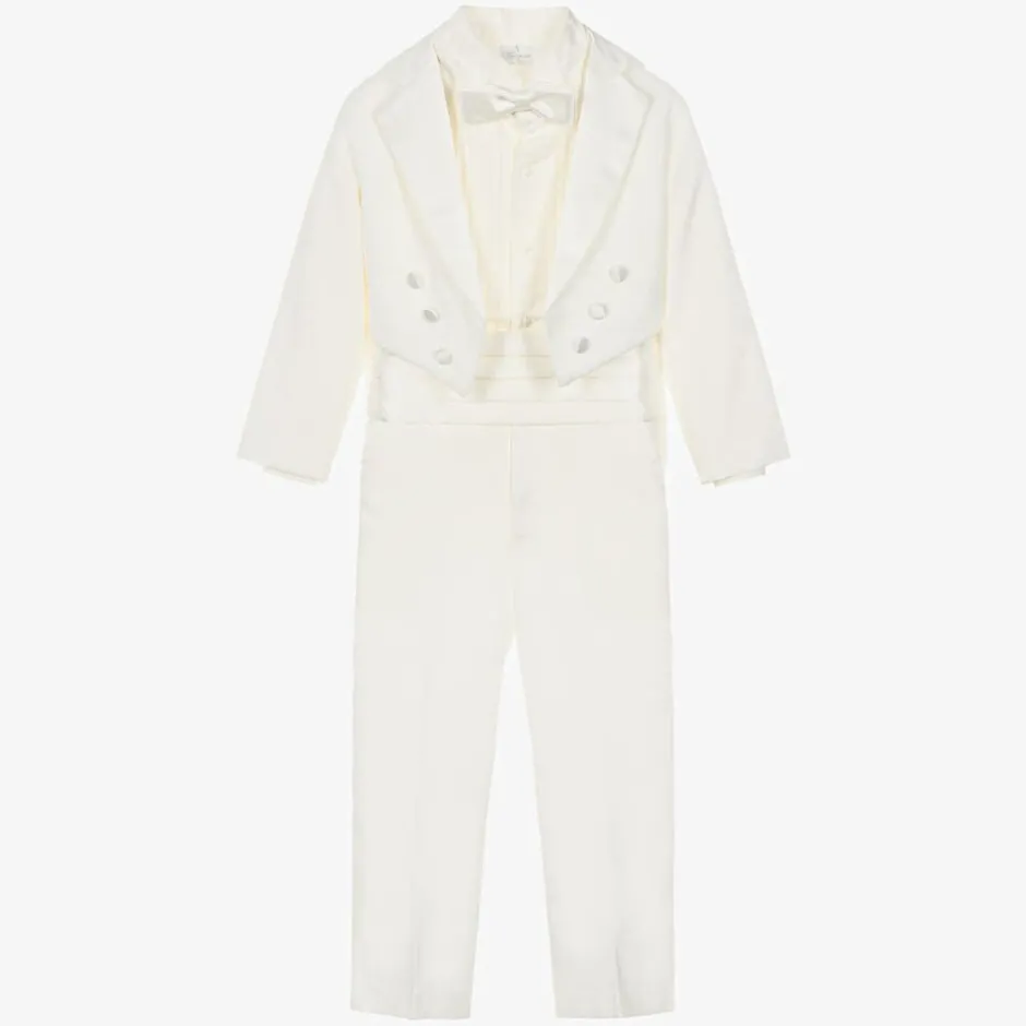 Boys ivory special occasion tuxedo suit by Romano. This elegant suit comprises a tailcoat jacket, trousers, white pintuck style shirt, bow tie, and cummerbund. The jacket has satin lapels and buttons and the trousers have a comfortable elasticated waistband and a satin stripe at each side for a stylish finish.