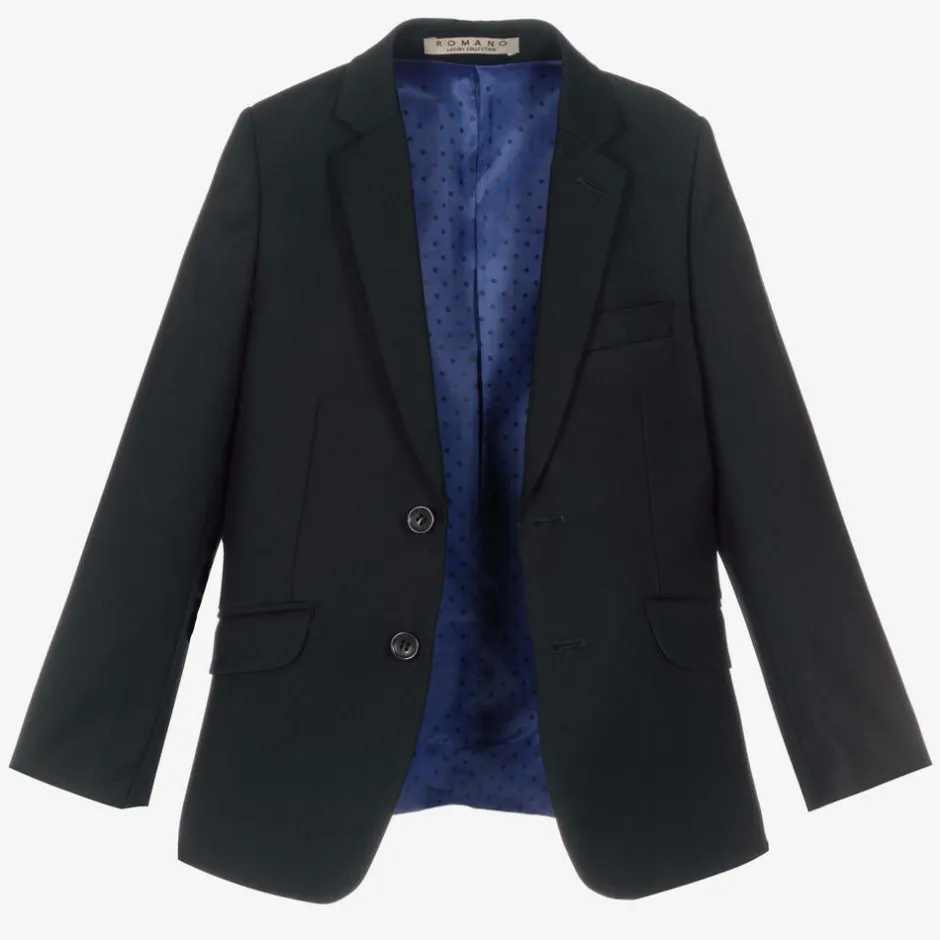 Boys dark navy blue suit from Romano's luxury collection. Beautifully made from a soft viscose mix, the single-breasted jacket is fully lined in silky satin and the trousers have an adjustable elasticated waist for comfort. To complete the suit, it comes with a matching waistcoat.