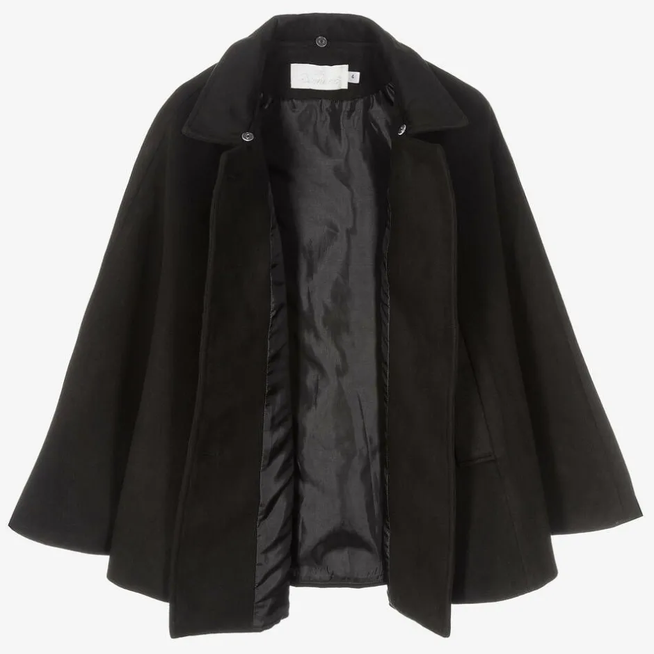 Smart black cape for girls by Romano, with a detachable faux fur collar. It has a soft felted feel and a satin lining. It fastens with decorative ivory and gold crest buttons and has matching buttons on the arm openings.