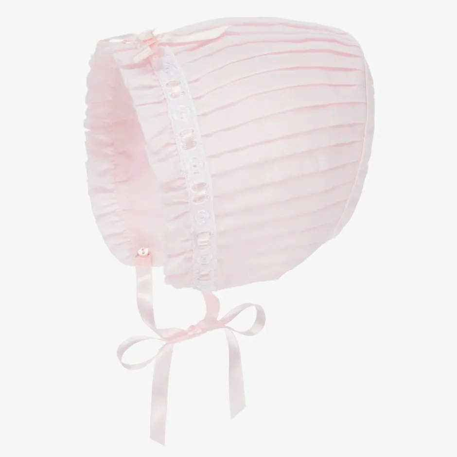 Baby girls traditional pale pink pleated bonnet by Sarah Louise. It is made in soft polycotton. with a pretty broderie anglaise and ribbon trim. The back is gently elasticated and it ties under the chin to keep it in place.