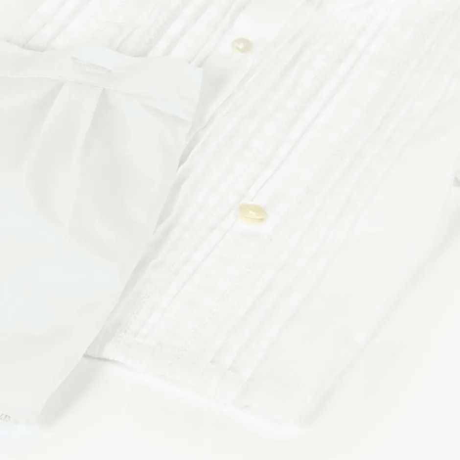 Smart and traditional, an ivory cotton-blend shorts set for little boys by Sarah Louise, made in lightweight poplin. The shirt has beautiful, hand-embroidered pin-tuck detailing, whilst the lined shorts have an adjustable, semi-elasticated waist for a great fit. The shirt buttons onto the shorts, keeping boys neat and tidy.