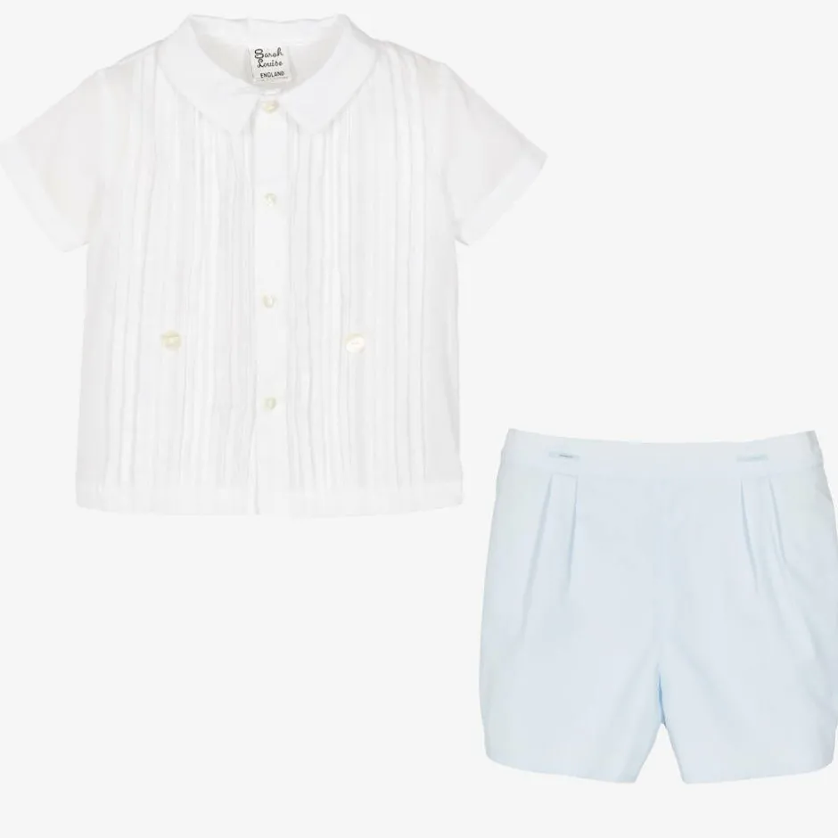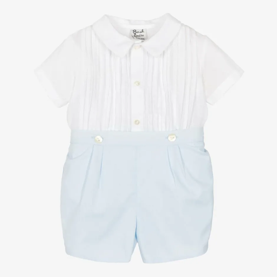Smart and traditional, a white and pale blue cotton-blend shorts set for little boys by Sarah Louise, made in lightweight poplin. The shirt has beautiful, hand-embroidered pin-tuck detailing, whilst the lined shorts have an adjustable, semi-elasticated waist for a great fit. The shirt buttons onto the shorts, keeping boys neat and tidy.