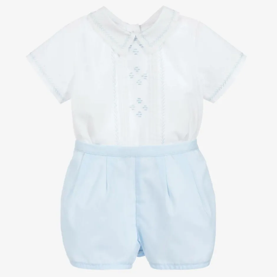 Little boys white and blue shorts set from Sarah Louise, made in soft and lightweight polycotton. The shirt has pretty blue embroidery and pintuck pleating. The shorts are fully lined, with an elasticated waist and leg cuffs.