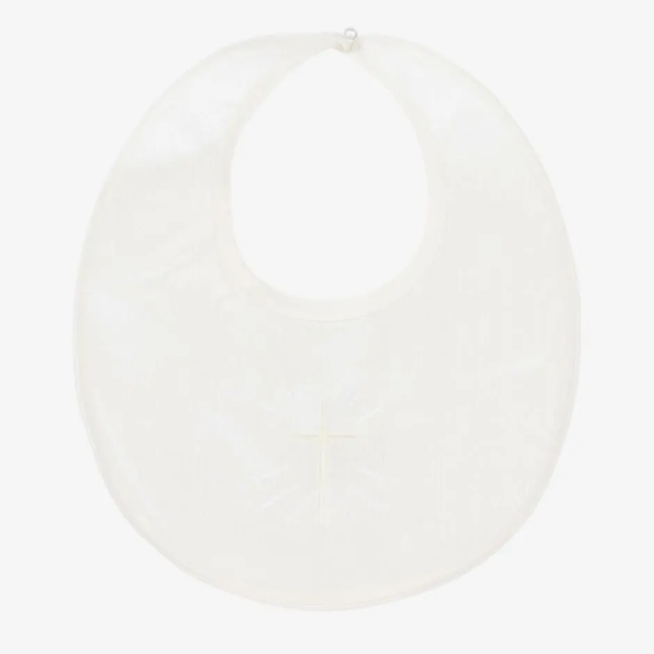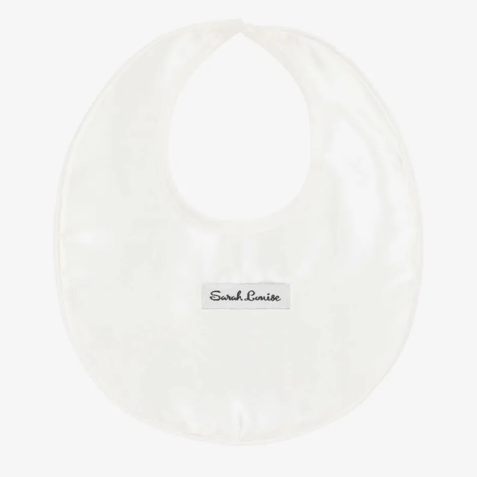 Sarah Louise ivory silk bib for baby boys and girls, with a delicate embroidery and a pearl button to fasten.
