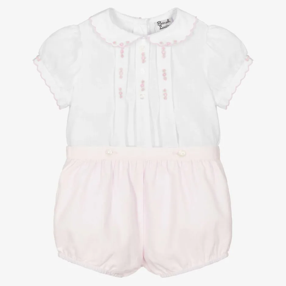 Younger girls pink and white traditional style shorts set by Sarah Louise. Made in soft polycotton, with pleating, pretty scalloped trims and pink and green hand-embroidery. The top cleverly buttons onto the lined shorts for a neatly tucked in look.