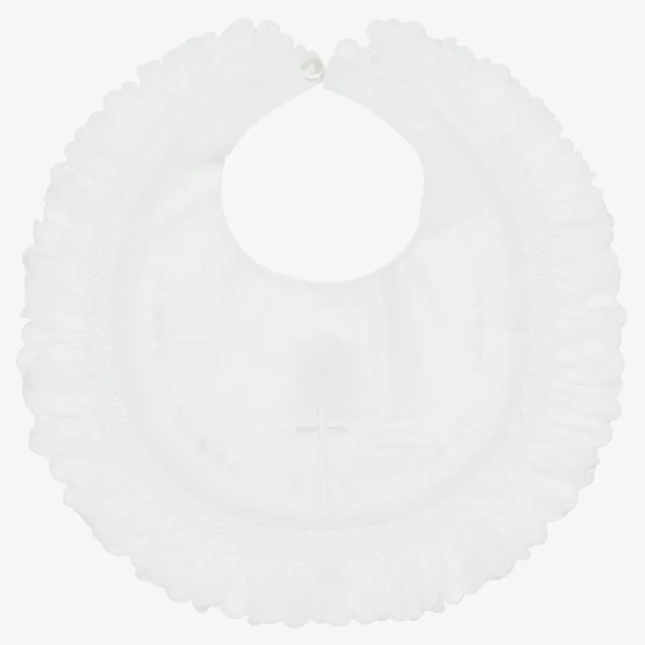 Sarah Louise white, hand-smocked bib with pretty frilled trims and embroidered flowers.