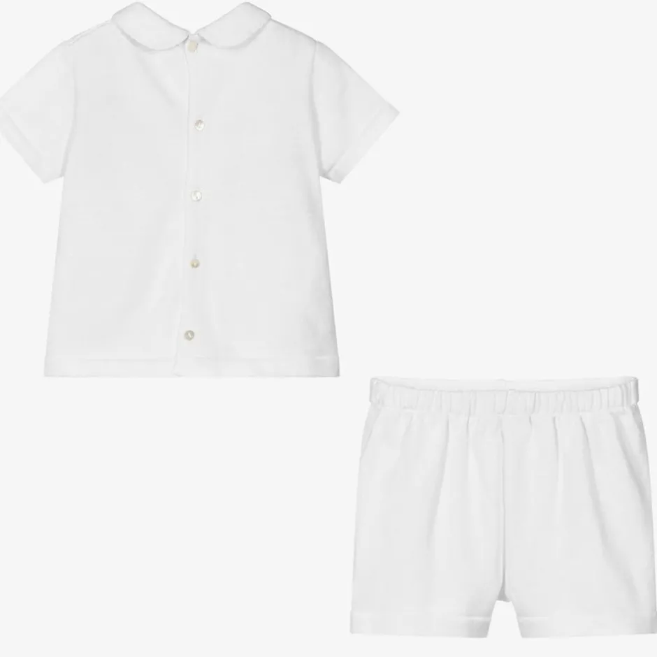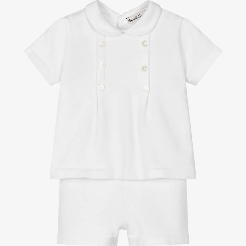 Smart white top and shorts set for little boys by Sarah Louise, knitted in soft cotton. The top has a rounded collar and pleats on the front with decorative buttons. The shorts have an elasticated waistband and decorative buttons on the front.
