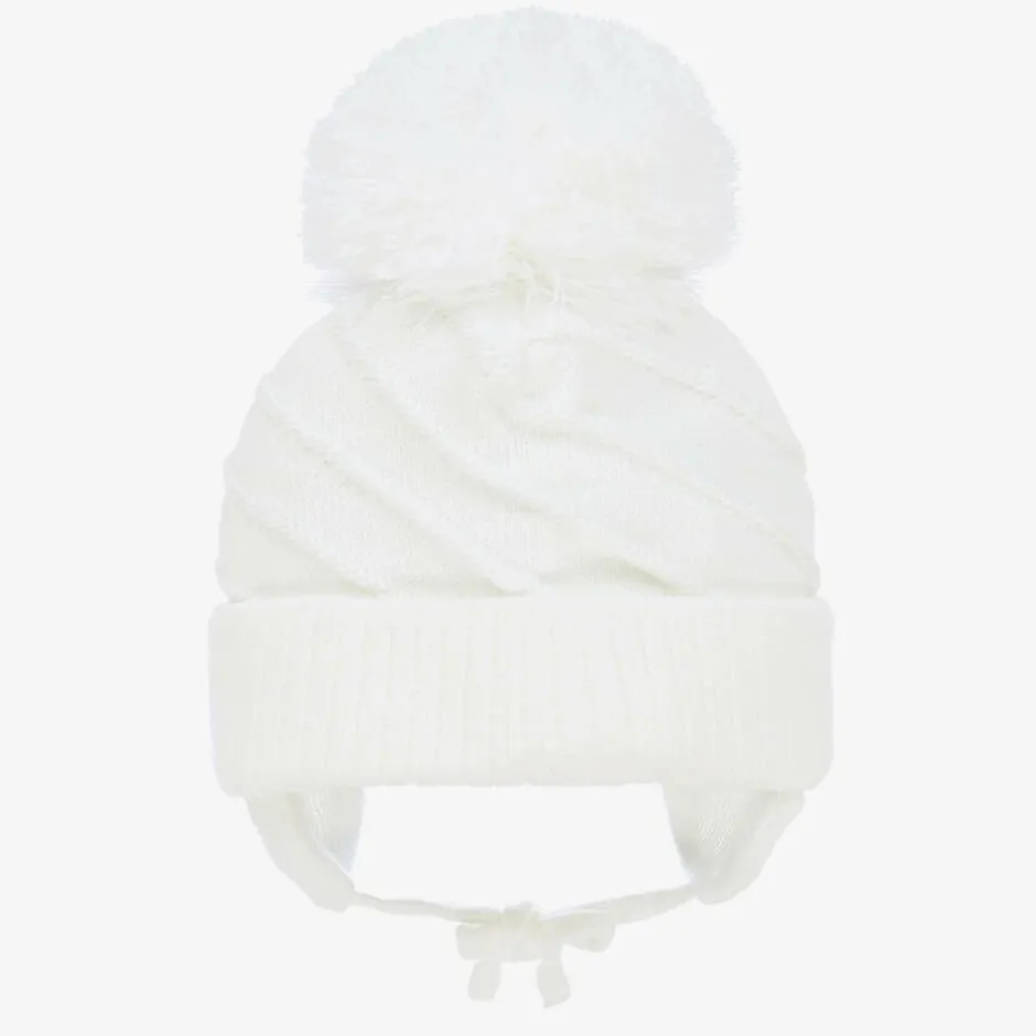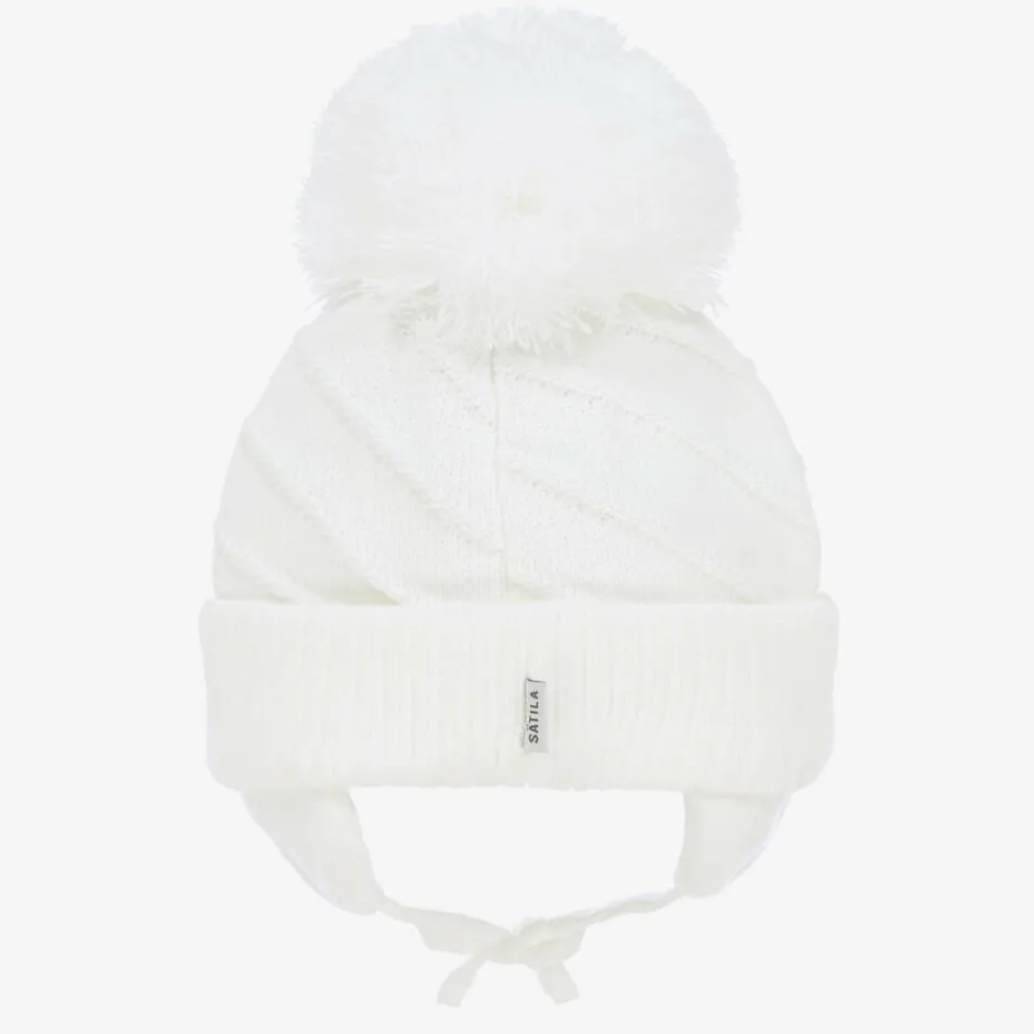 A white winter hat for boys and girls by Sätila of Sweden, made from a chunky knit with diagonal rib detailing. For a cute look, it has a giant pom-pom on top, a turned-up brim, and charming ear flaps with ties that fasten under the chin. It is partially lined in knitted cotton for additional warmth and comfort.