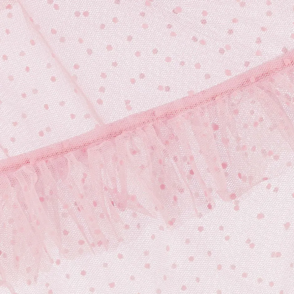 A beautiful pink cape for girls by Self-Portrait, made in fine tulle for a lightweight feel. A great addition to any special occasion outfit, this lovely piece has an ombré finish, gradually changing from pink to white at the hem. Delicate pink polka dots can be seen throughout the fabric and pretty ruffles add texture all around. There is a pink grosgrain trim on the neckline with a decorative bow and a popper fastening.