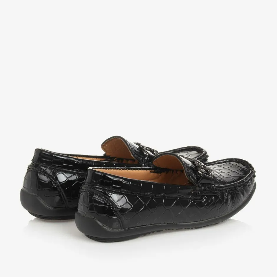Stylish black patent loafers for boys by Sevva, with pewter horsebit detailing. Lovely for a special occasion, they are made of faux crocodile leather with a black rubber non-slip sole for a great grip. Easy to slip-on, they are also fully lined with faux leather for added comfort.