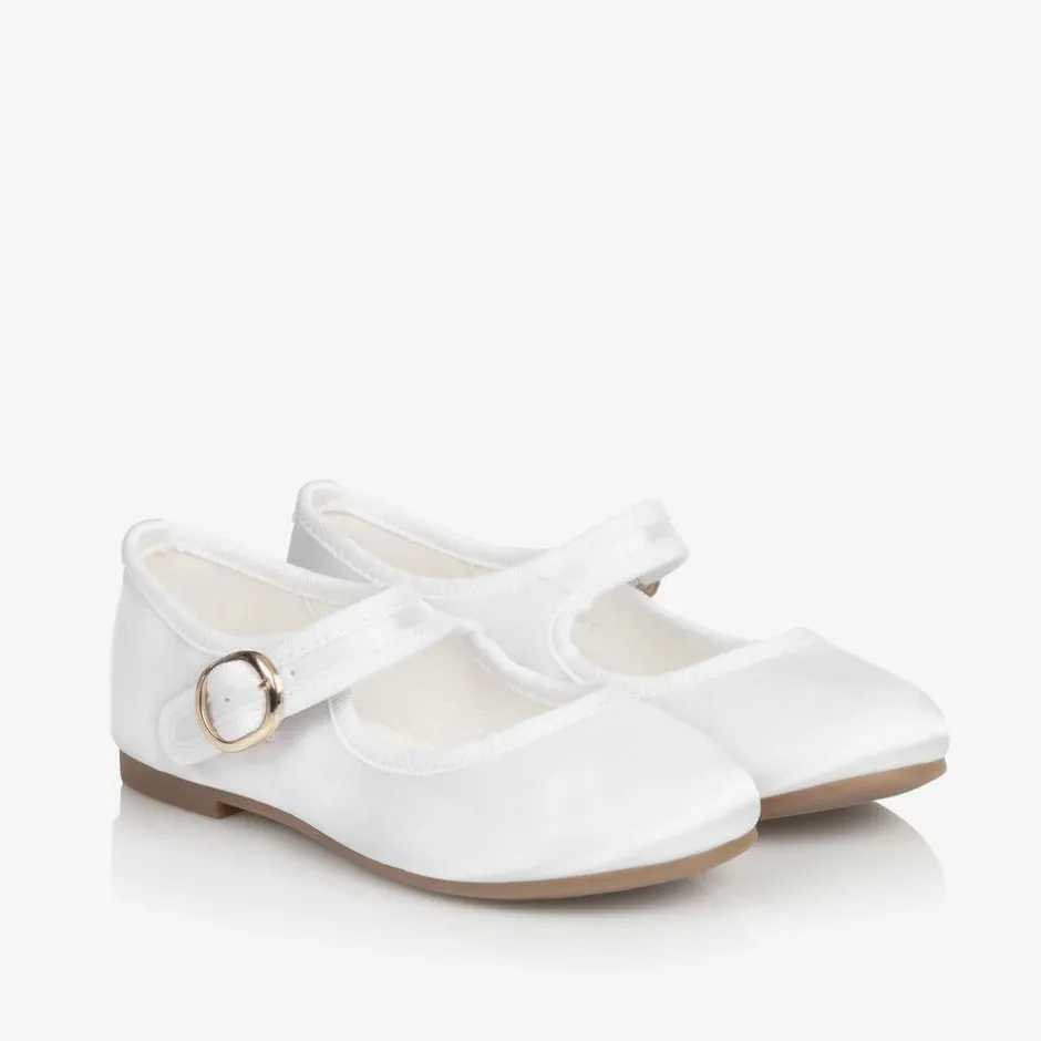 Gorgeous white shoes for girls by Sevva, made in smooth satin with a beautiful sheen. Lovely for a special occasion, this elegant style has a faux leather lining, a gently cushioned insole and a flexible, non-slip rubber outer sole. For an ideal fit, they have an adjustable strap across the foot with a gold buckle fastening.