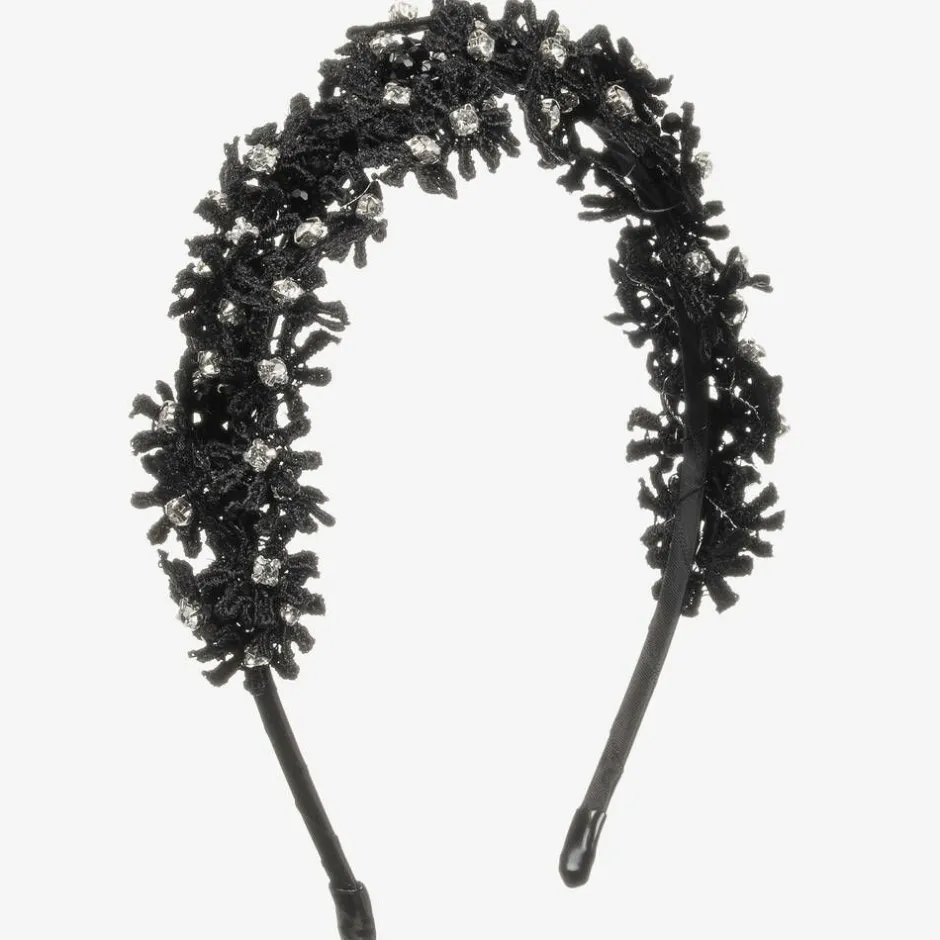 A stunning handmade hairband by Sienna likes to party. The band is covered with black satin and it has beautiful black lace flowers with sparkly diamanté.