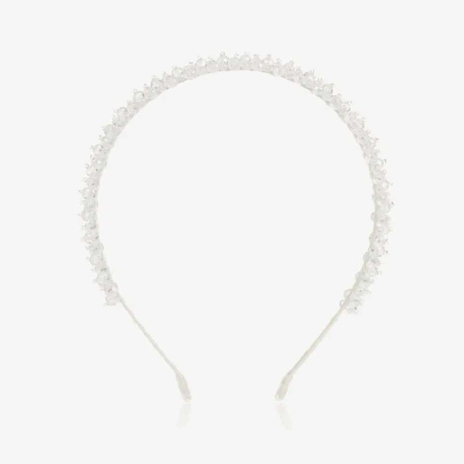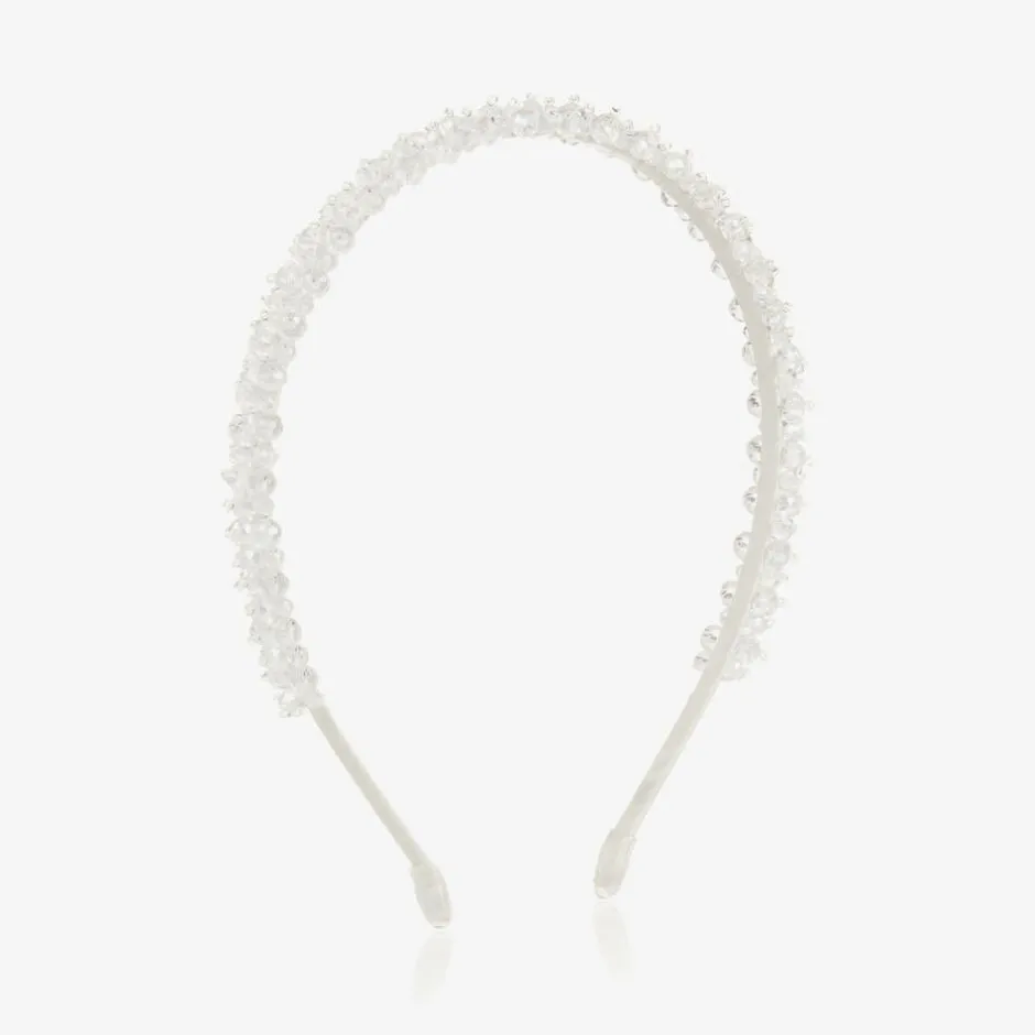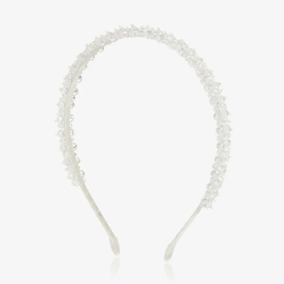 A stunning beaded hairband for girls by Sienna likes to party. Lovely to complete an outfit, the white satin-wrapped metal band is embellished with gorgeous clear crystal beads.