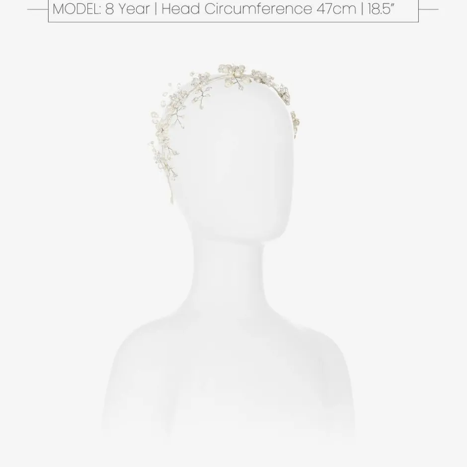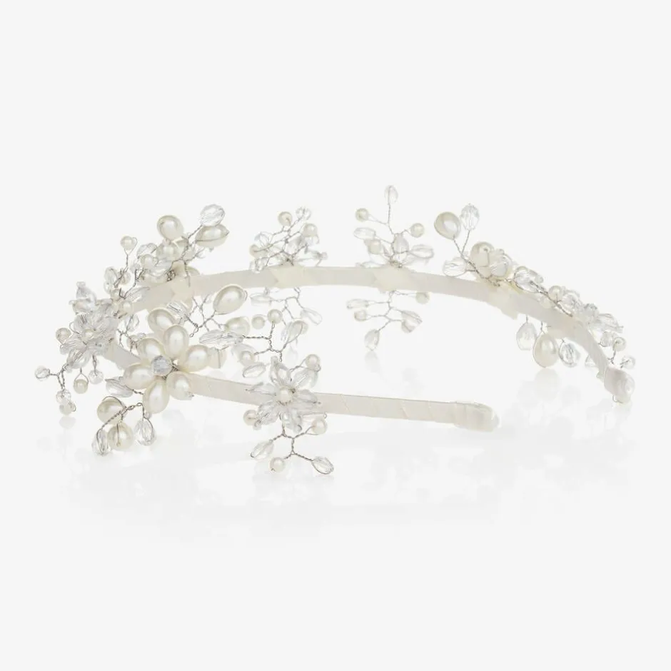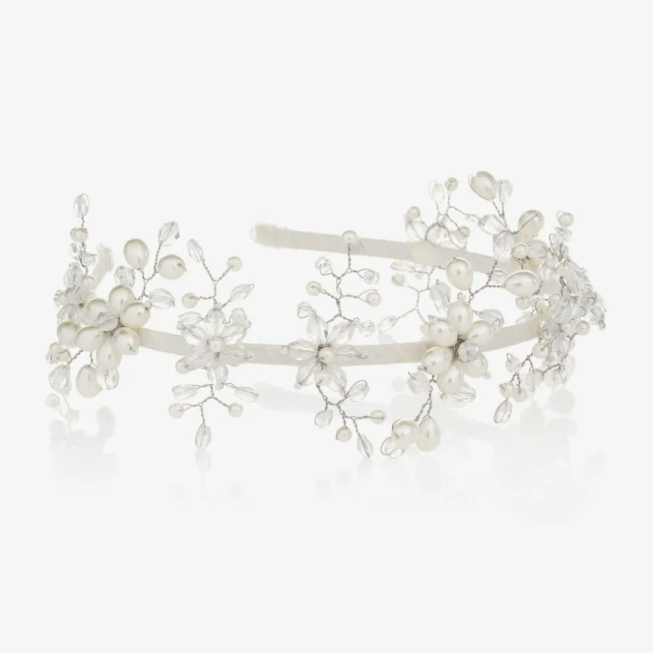 Girls beautiful ivory satin covered hairband by Sienna likes to party, with sparkly crystal and pearl flowers and silver metal wirework.