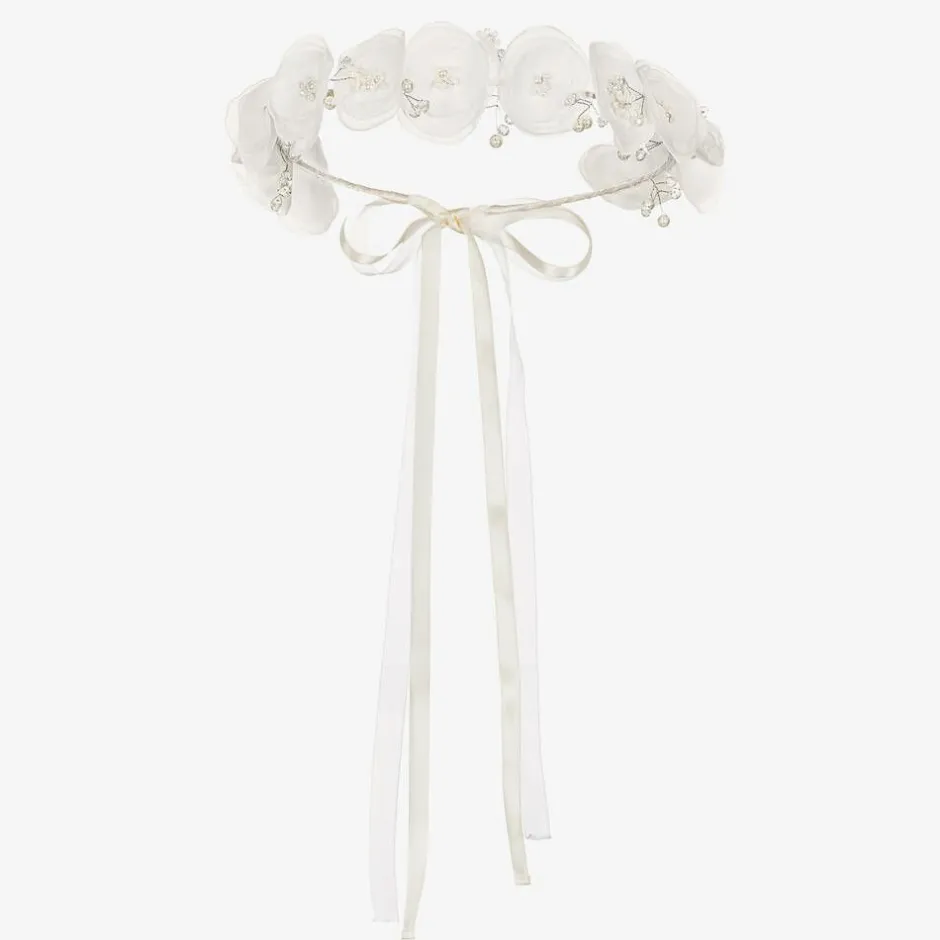 Girls beautiful ivory satin garland with white organza poppies by Sienna likes to party. The flowers have pearl and crystal beads in their centres and are detailed with tiny embroidered daises and silver metal wirework. This lovely vintage-style garland fastens at the back with white organza and ivory satin ribbons which will trail slightly down the back.