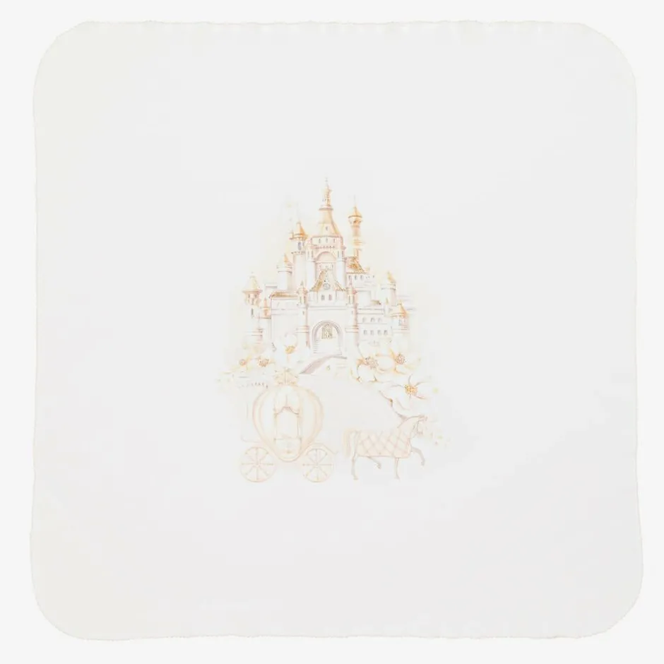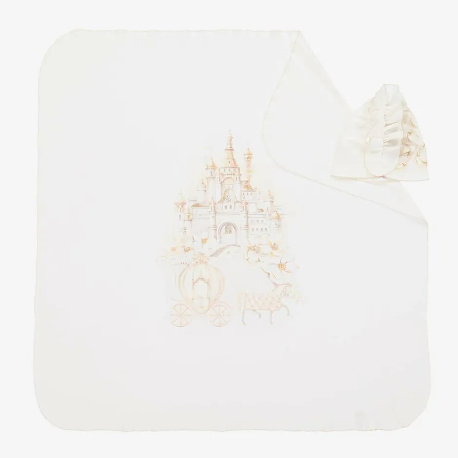 An ivory cotton blanket and hat gift set for baby girls by Sofija, with an enchanting princess castle and floral design in soft shades of beige. Beautifully lightweight, the lovely blanket makes a charming nursery accessory. Ideal for wrapping snuggly around baby, it can also be used in the pram or stroller. Patterned with matching florals, the sweet hat is trimmed with a pretty ruffle.