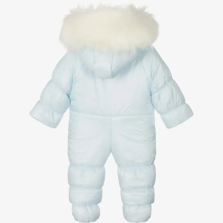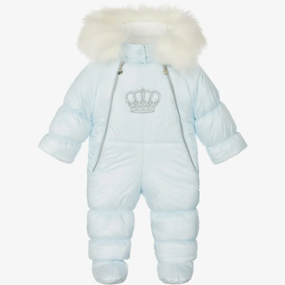 Exclusive to Childrensalon, a silky pale blue snowsuit for baby boys and girls by Polish brand Sofija, with a shiny silver crown embroidered on the front. Warmly padded with a cosy, faux fur-trimmed hood, it is lined in soft, comfortable cotton jersey. The snowsuit has a double front zip closure, a popper-fastening internal panel, cuff inserts and detachable booties for extra cosiness.