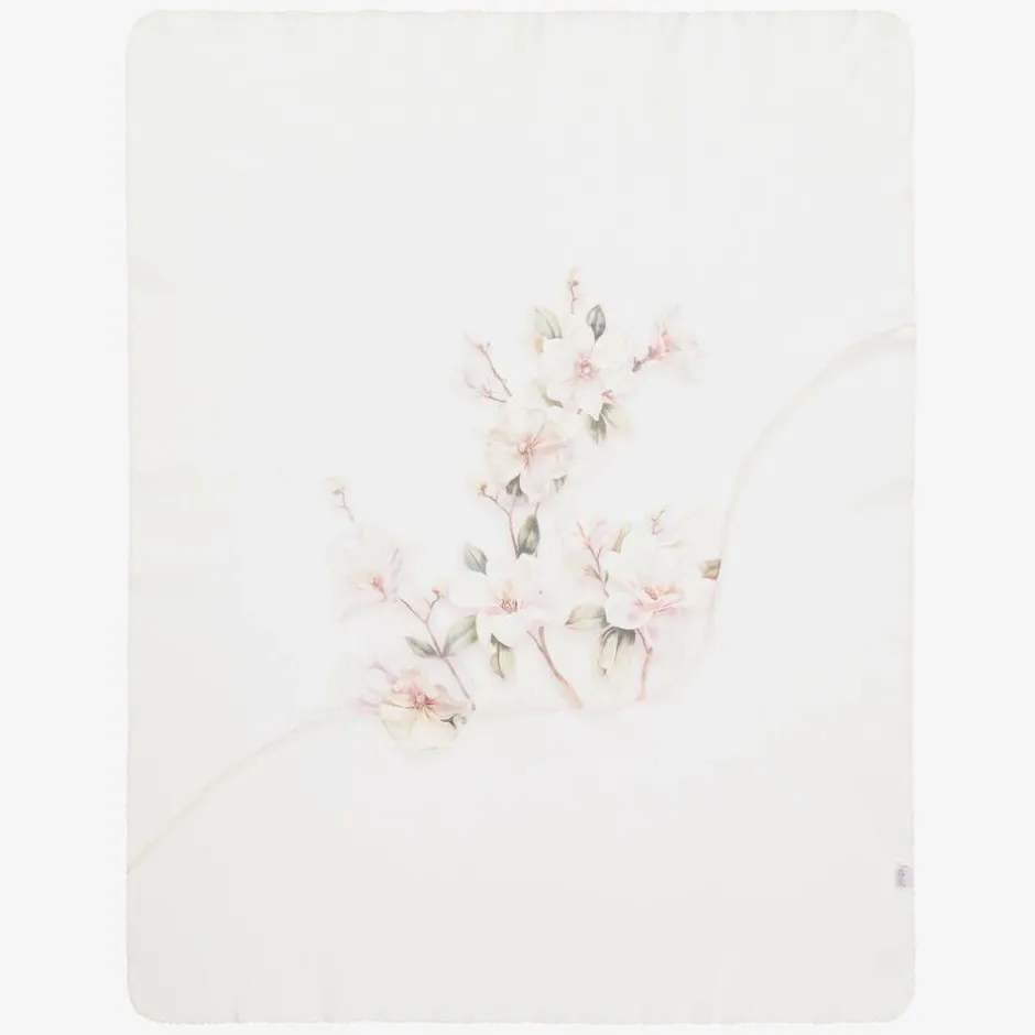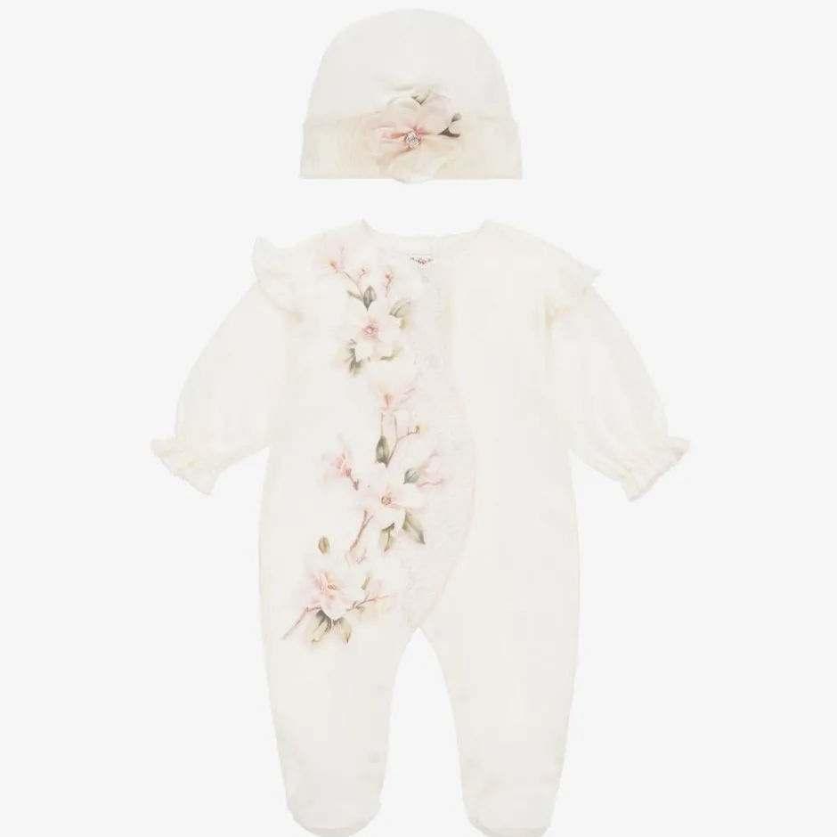 Baby girls ivory babygrow, hat and blanket set by Sofija, exclusive to Childrensalon. Made with super soft cotton, the set includes a popper-fastening babysuit with capped shoulder trims, printed with a pink floral print on the front. The hat has a flower trim on the brim and diamanté detailing. The blanket is lightweight and has a matching pattern.