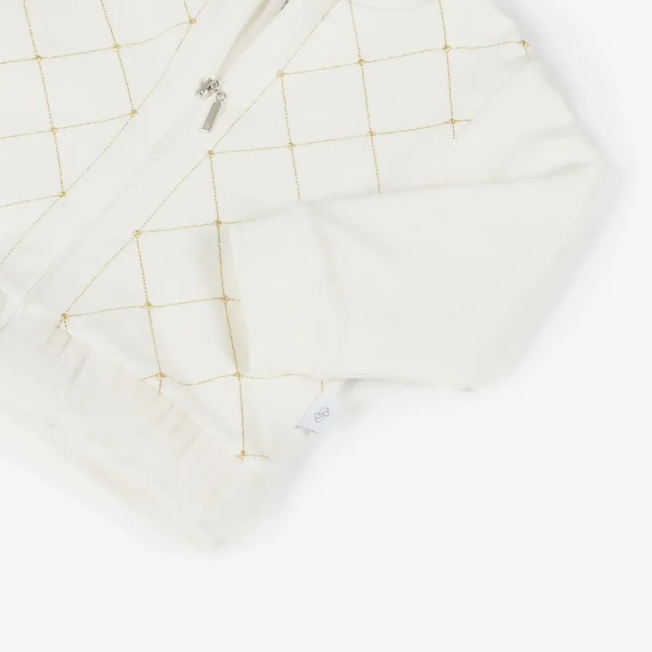 Ivory tracksuit for little girls by Sofija, made from soft cotton jersey. Trimmed with a tulle ruffle, the zip-up hoodie has a stylish check design on the front, embroidered in shimmery gold thread. The matching joggers have a gently elasticated waistband for a comfortable fit.