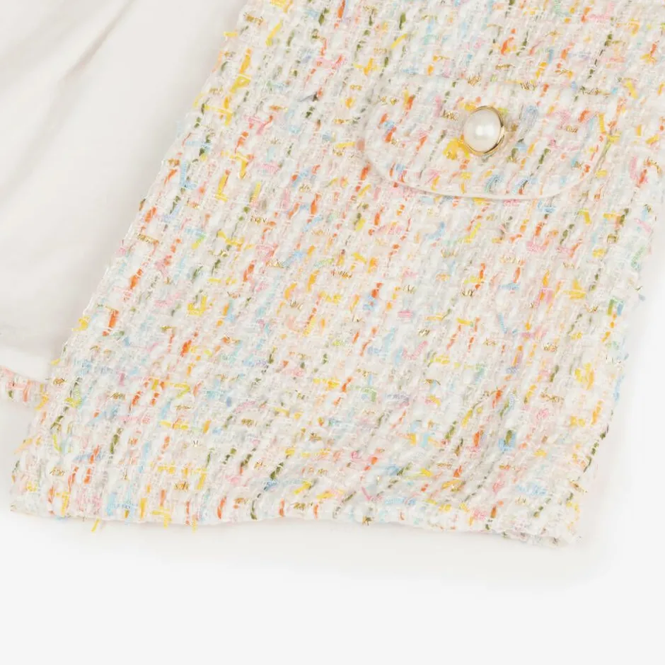 Exclusive to Childrensalon and in a traditional style, this soft cotton tweed coat for little girls is by Sofija. With colourful thread in the weave, it has gold-trimmed, pearl bead button fastenings and faux pockets on the front. There is a jersey lining for comfort.
