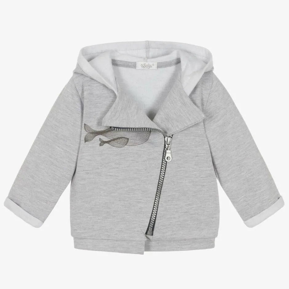 Exclusive to Childrensalon, a grey and blue trousers set for baby boys by Sofija, made in soft and stretchy cotton jersey. The trousers and hooded zip-up top are in a grey marl colour with turned up cuffs. There are grey whales embroidered on the front of the zip-up top and the pale blue T-shirt.