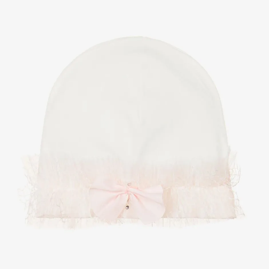 A pretty ivory hat for baby girls by Sofija, made in soft cotton jersey. Trimmed with pink tulle, a small pink bow and diamanté, it has an elasticated trim.