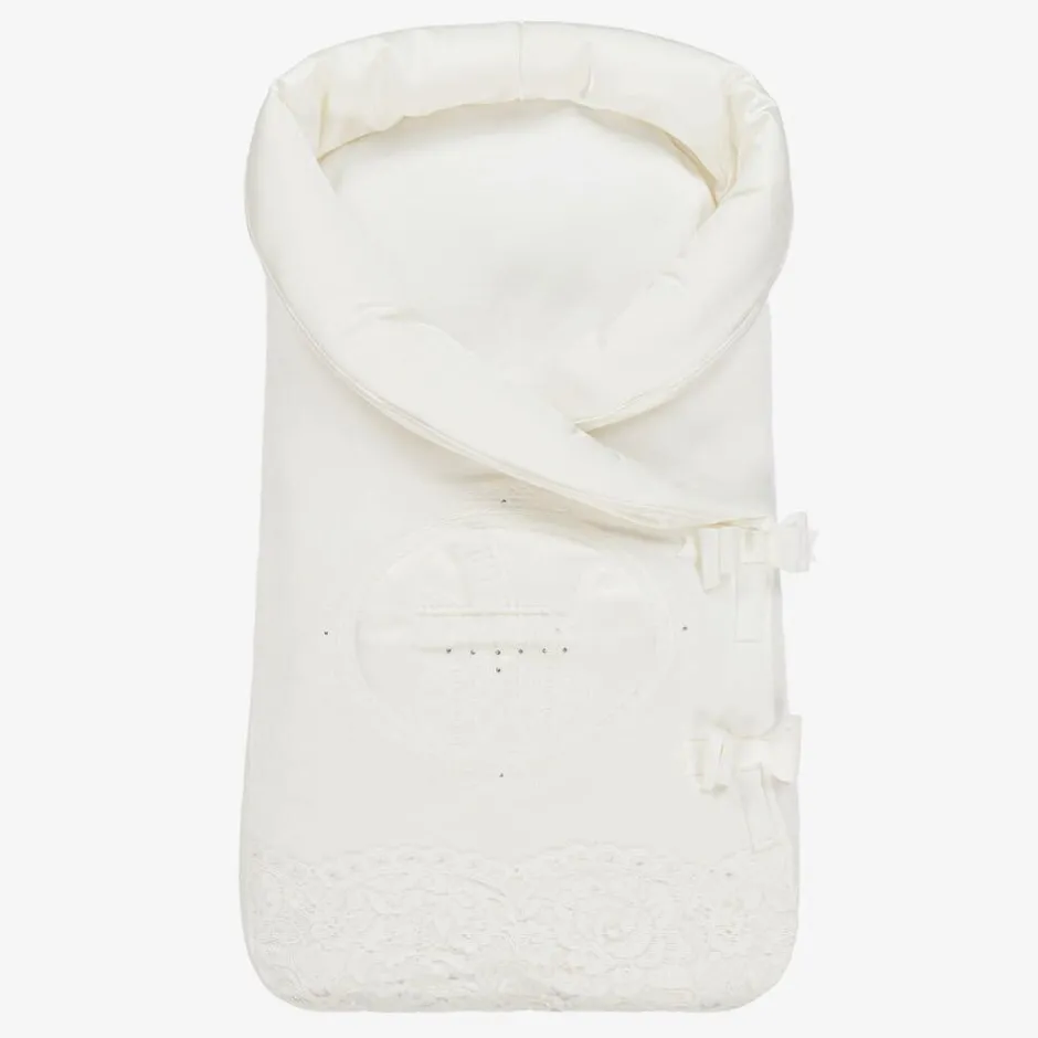 An elegant way to present a new baby, this beautiful ivory nest by Sofija will be cherished by your family. Softly padded for comfort, the nest is embellished with embroidery, satin and lace trim, perfect for baby's special day.