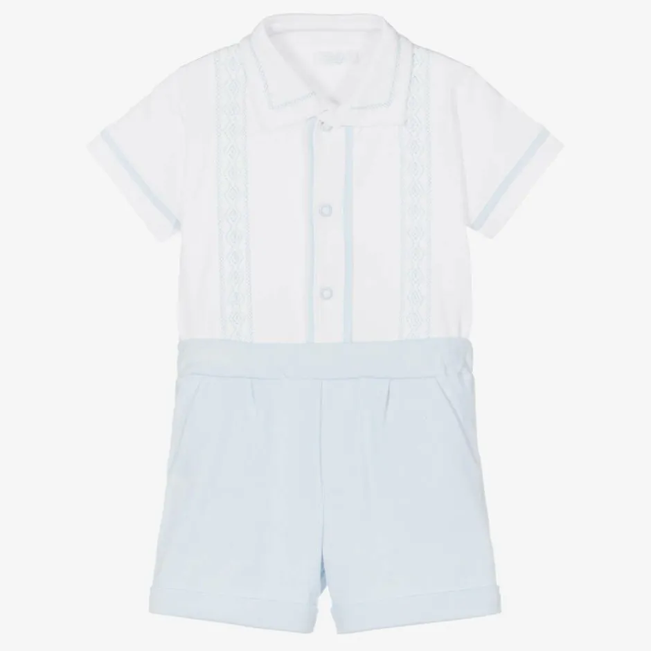 White and pale blue shorts set for baby boys by Sofija, made in soft and stretchy cotton jersey. Exclusive to Childrensalon, the white bodyvest has beautiful blue embroidery with pale blue trims. The blue jersey shorts have turned up cuffs and an elasticated waist for a comfortable fit.