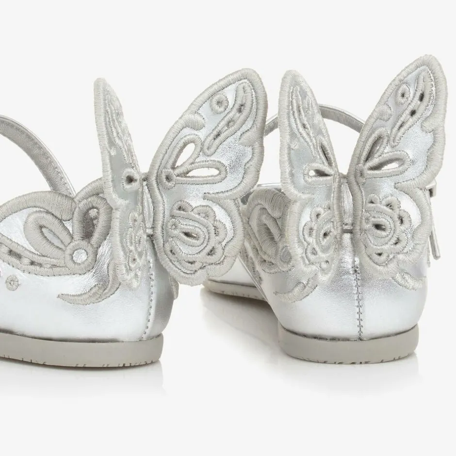 Eye-catching silver leather shoes for girls from Sophia Webster Mini, with beautiful cut-out butterflies on the back. The supple leather and lightly cushioned insoles add comfort to these lovely occasion shoes. There is a buckle fastening strap across the foot for a secure fit.