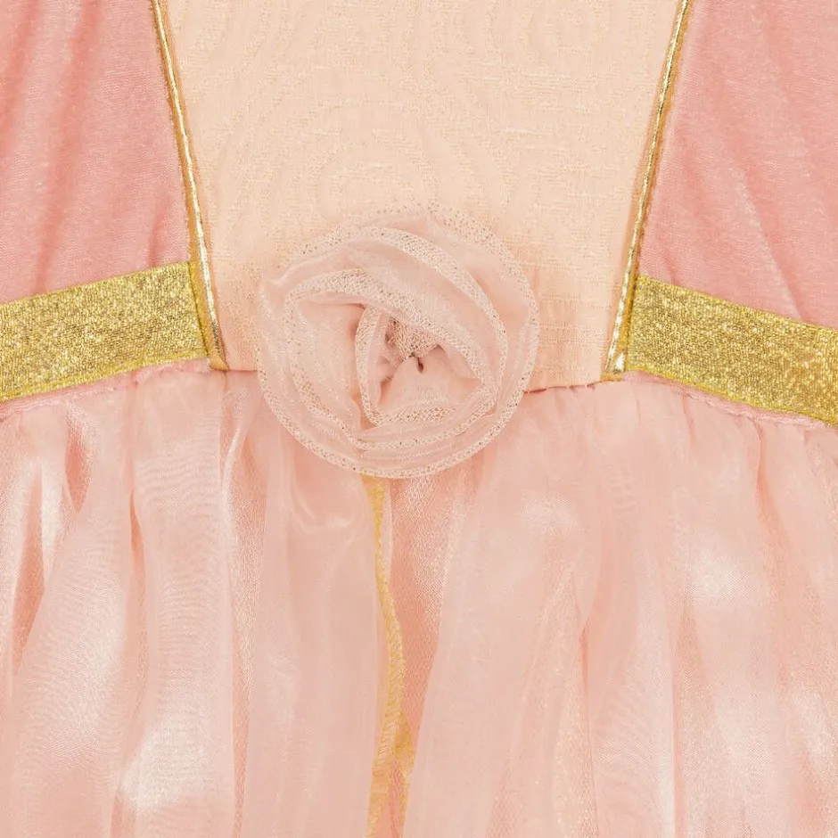 Girls will feel as pretty as a princess in this pink dress costume by Souza. Fabulous and striking, the bodice is shaped in a classic silhouette, with golden piping, soft velour, and a rose-patterned panel. The puffed sleeves are trimmed with voluminous layers of organza and the sparkling gold waist is detailed with a rose motif. The skirt is made in sparkling organza and gold dotted tulle, with a satin lining for comfort. The stretchy velour bodice ensures it is easy to slip on over the head.