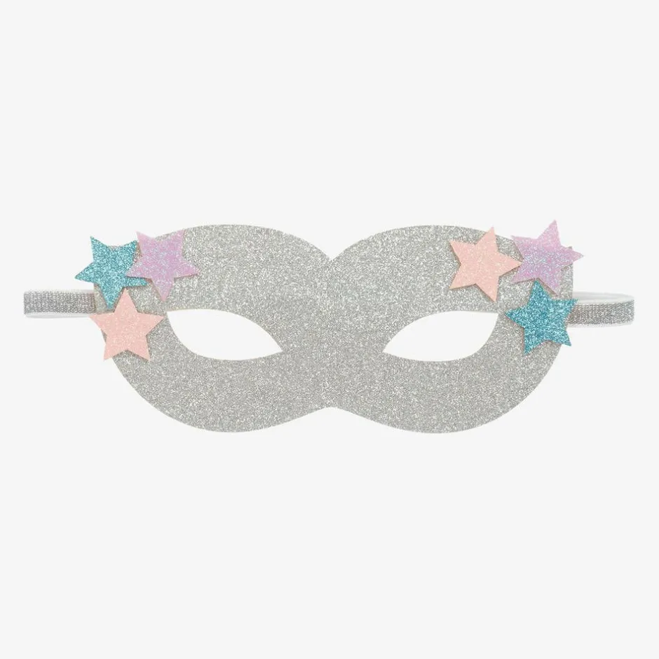 A glamorous addition to any dressing-up box, this silver sparkly superhero mask for girls is by Souza. Made from stiffed felt, it is decorated with pretty pink, blue, and purple stars for extra fun. Comfortable to wear, it has a matching elasticated strap that fastens neatly with velcro on the back.
