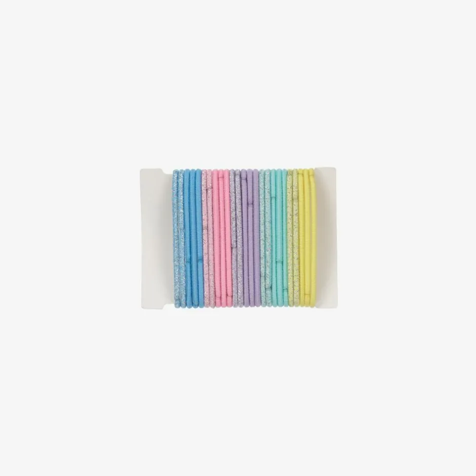 A pack of 25 thin hair elastics for girls by Souza. Soft and stretchy, these fabric elastics come in an assortment of bright colours, with two sparkly bands per colour.