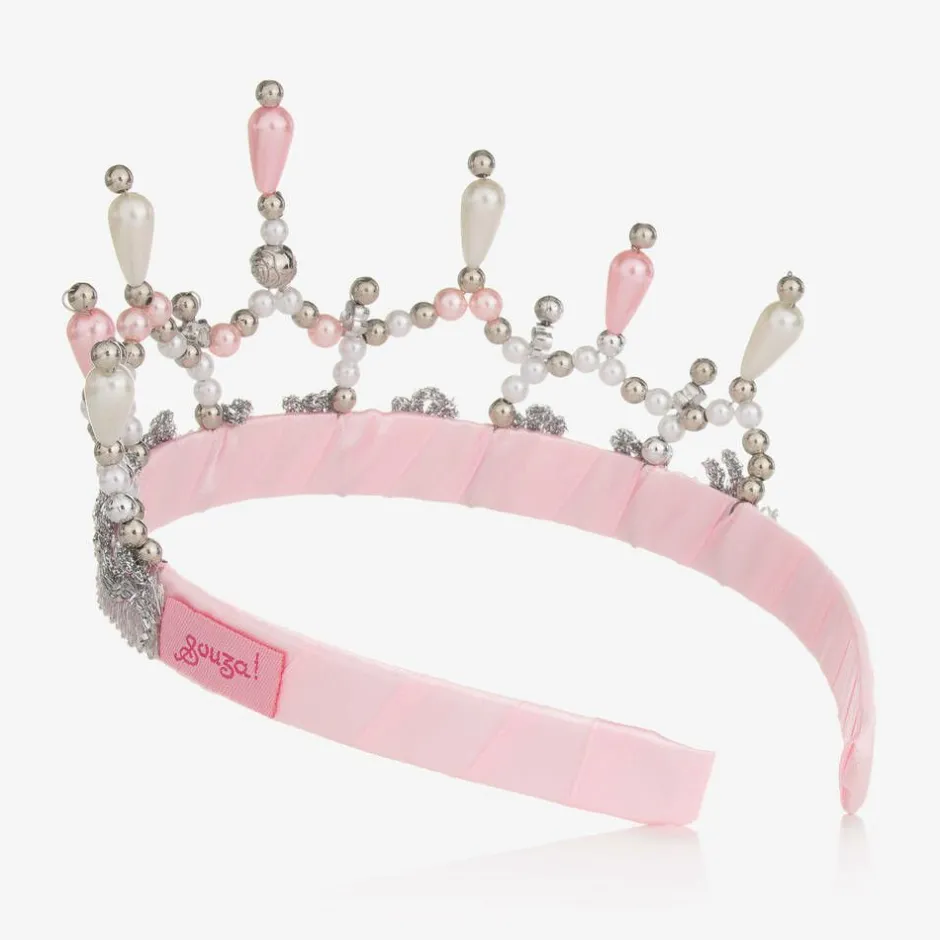 Girls pink and silver crown from Souza. The flexible band is covered in satin ribbon and the crown is decorated with pretty pink, silver and pearl beads.