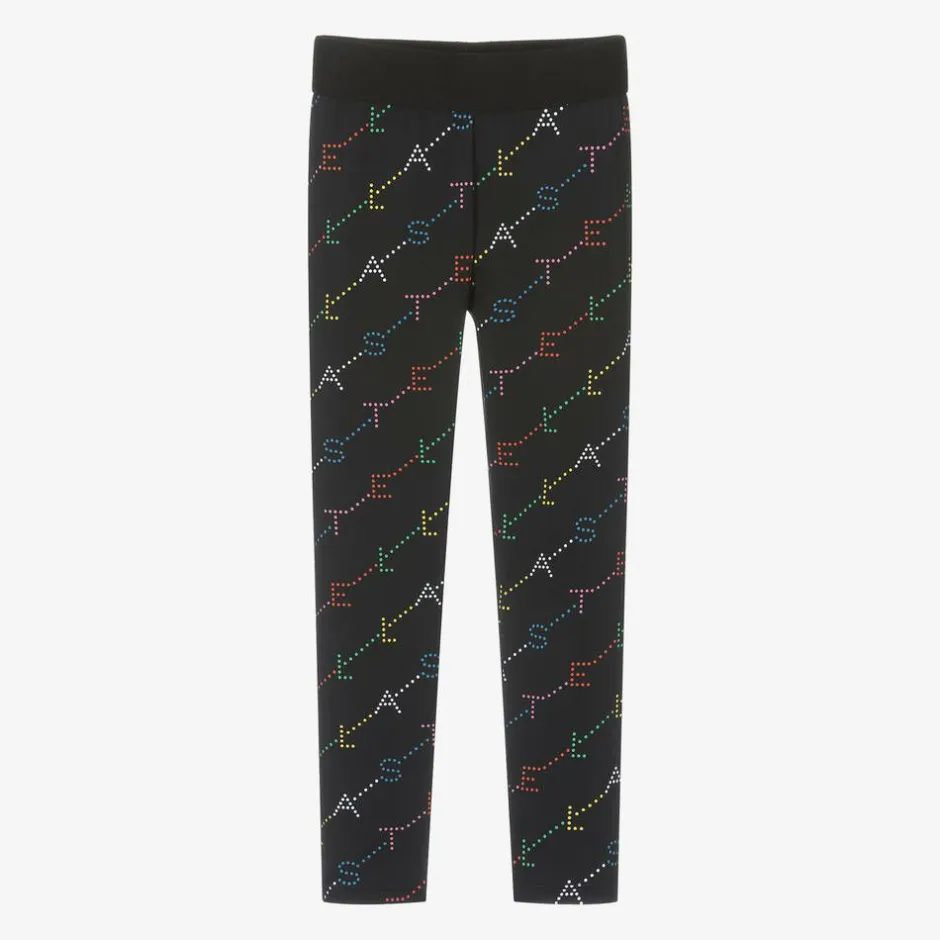 Black leggings for girls by Stella McCartney Kids with a colourful, diagonal logo design for instant designer appeal. Silky and stretchy, this sporty style is made from recycled material, ideal for casual, comfortable wear. The Stella McCartney fit can be quite small so choose a size up if you want room to grow.