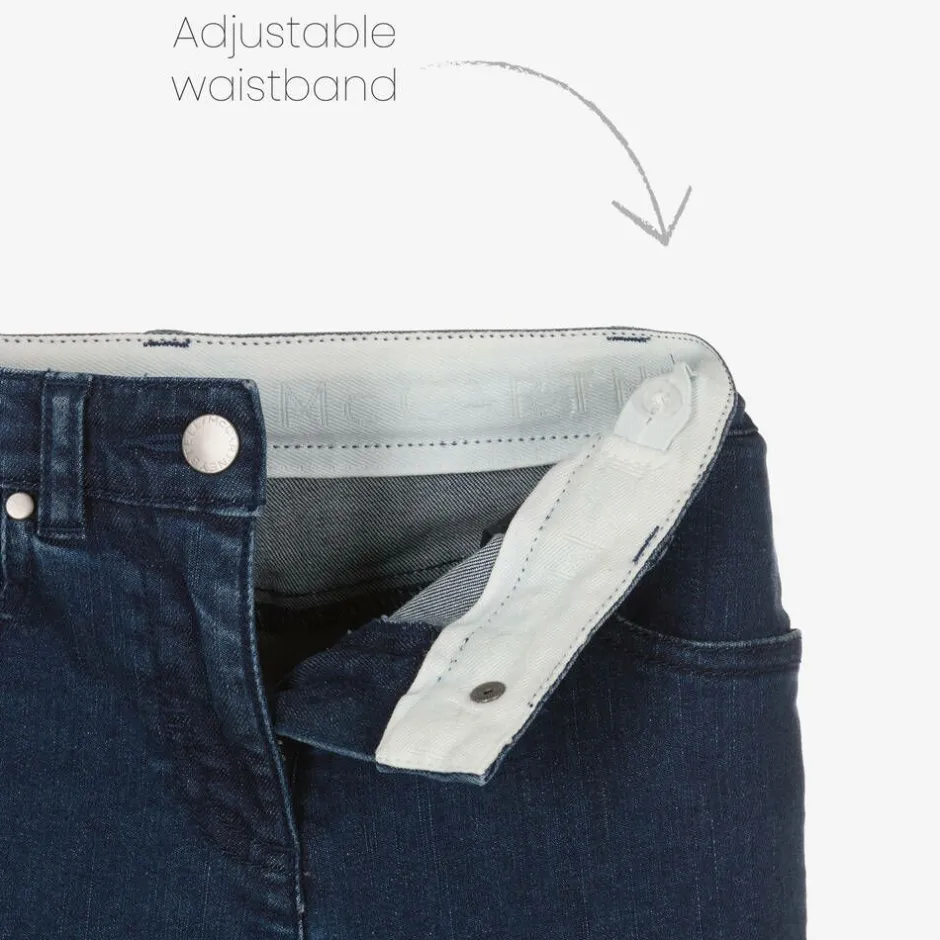 Dark blue denim jeans for girls by Stella McCartney Kids, decorated with 3D pom-poms for a colourful touch. Made from organic cotton, these skinny jeans have five-pocket styling and fringing on the ankles for extra detail. They have an adjustable waistband with a black logo tab on the back. They are finished with dark grey rivets and a hook and zip fastening on the front. The Stella McCartney fit can be quite small so choose a size up if you want room to grow.