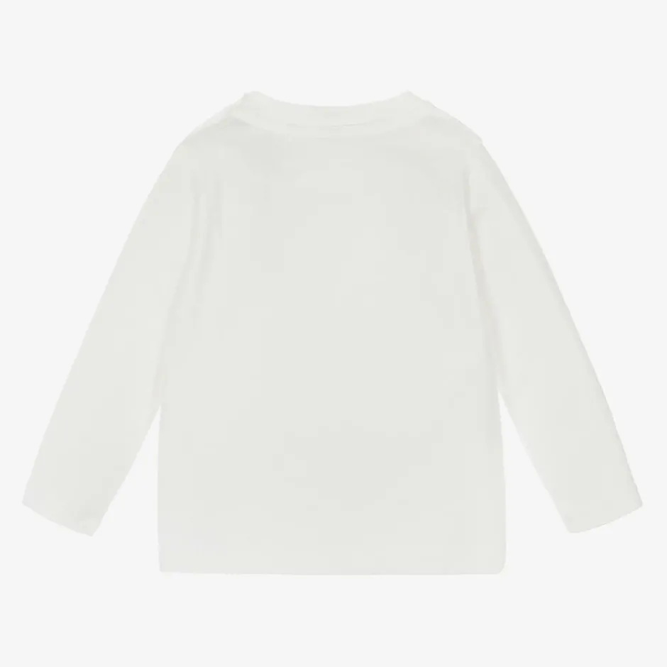 Ivory long-sleeved top for younger girls by Stella McCartney Kids, made in soft organic cotton jersey. Cute and playful, there is a smiling face printed on the front, with blue and green flower eyes. It is casually styled with a lightly ribbed crew neckline and has poppers on one shoulder to help with dressing. The Stella McCartney fit can be quite small so choose a size up if you want room to grow.