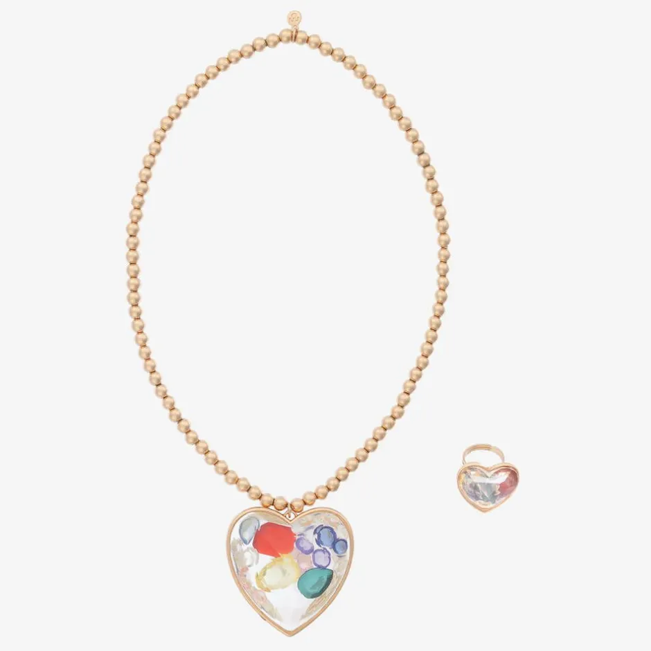 Eye-catching gold tone necklace and ring set for girls by fashion accessory brand Super Smalls. Both pieces have matching jewelled hearts filled with colourful gems that can move and shake for an added fun element. The beaded gold tone chain is stretchy with a logo charm on the back and the ring is adjustable for a good fit. Presented in a branded box, this duo accessory will add some sparkle and bold statement to any look.