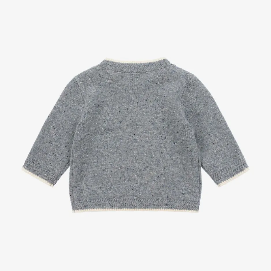 A lovely blue-grey long-sleeved sweater for younger boys by classic French designer Tartine et Chocolat, knitted in a beautifully warm wool. This cosy piece features a sweet polar bear on the front in an intarsia knit. It has coordinating white trims and fastens on one shoulder with buttons.