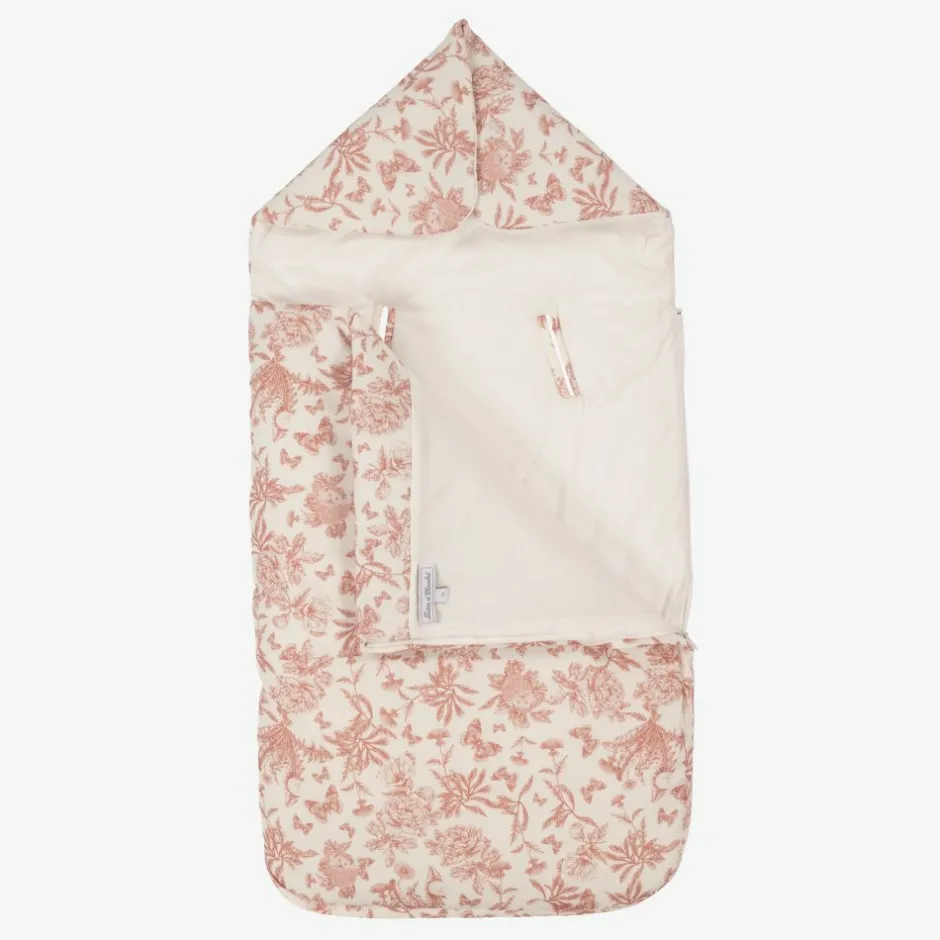 Ivory baby nest for girls by Tartine et Chocolat, made in comfortable cotton. Light padded, it has a lovely ivory and dark pink toile de Jouy botanical print with the brand's monogram embroidered in dark pink. Fully lined in soft white cotton, it has a zip fastening that runs down the side and along the base. The hood can be opened out and laid flat.