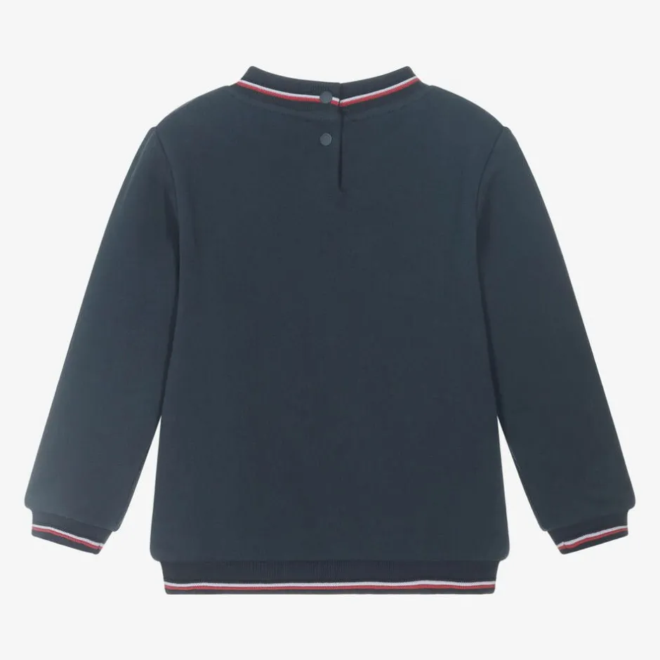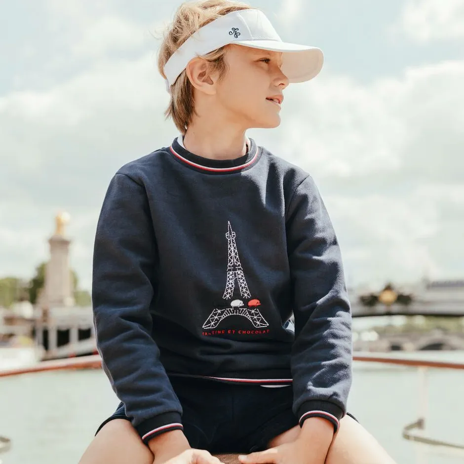 Navy blue sweatshirt for younger boys and girls by Tartine et Chocolat, made in soft and comfortable cotton jersey. Casually styled, this long-sleeved top is delicately embroidered on the front with the Eiffel Tower landmark, three hedgehogs and the designer's name. The stretchy ribbed trims have red, white and blue detailing for a coordinated look and there are useful poppers on the back to help with dressing.