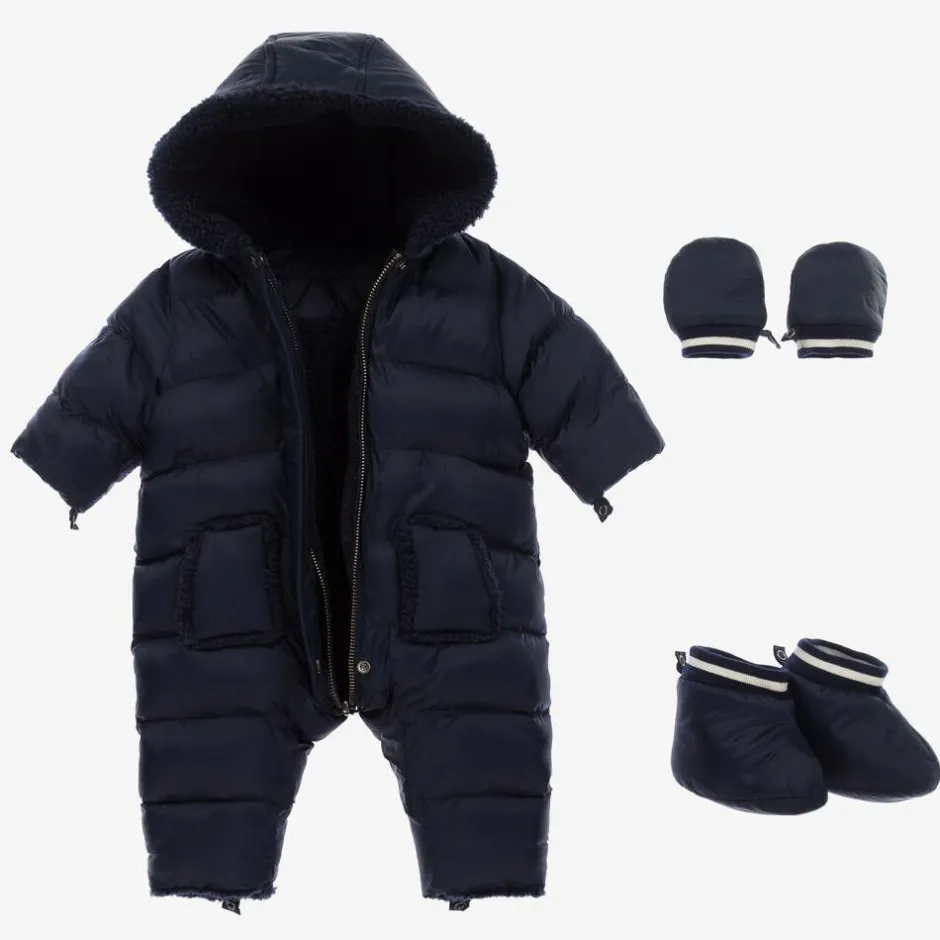 Reversible for two different looks, this navy blue hooded snowsuit for baby boys and girls is by French brand Tartine et Chocolat. Trimmed with navy blue and white striped ribbing, one side is silky smooth and in a puffer style, with a rubberised logo on one sleeve. The other side is made in soft, cosy teddy fleece, with silky smooth trims. Softly padded for warmth, both sides have useful pockets, with a zip and popper fastening down the front. There are coordinating detachable mittens and booties, secured with poppers to prevent them from becoming lost.