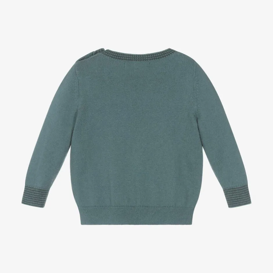 Green sweater for baby boys and girls by British brand the bonniemob, knitted in soft organic cotton with a touch of cashmere for added warmth and a touch of luxury. It has ribbed trims and a cute beige and green smiling acorn on the front. There are useful button fastenings on one shoulder and the designer's signature apple logo tab on one side seam.