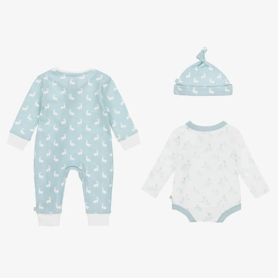 Sky blue babysuit set for boys and girls by The Little Tailor, made from soft cotton jersey for a gentle feel. The romper is patterned with white hares and finished with ribbed knit trims on the neckline and cuffs. The full zip front, allowing for easy nappy changes, has a protective zip guard under the chin for added comfort. In a different print, the long-sleeved bodyvest has a crossover front and fastens with poppers for easy dressing. The matching hat has an adorable knotted detail on the top and a turned-up brim. Ideal for the cot or car seat, the reversible, hooded blanket features coordinating patterns on either side. Making a lovely gift set, it also comes with a gift tag and bag.