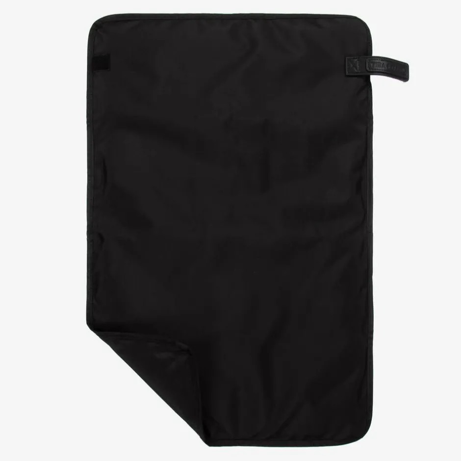 Beige changing bag by TIBA & MARL, made in soft quilted faux leather. The main compartment has an internal pocket and an insulated bottle holder. It fastens with a popper on an internal strap and a popper on the flap. There are multiple external pockets, attached stroller straps and a detachable, adjustable shoulder or cross-body strap. This compact bag has a dark grey metal logo on the front and comes with a padded changing mat.