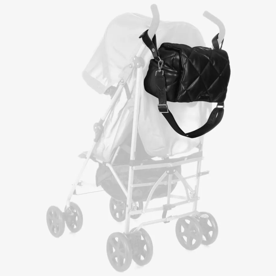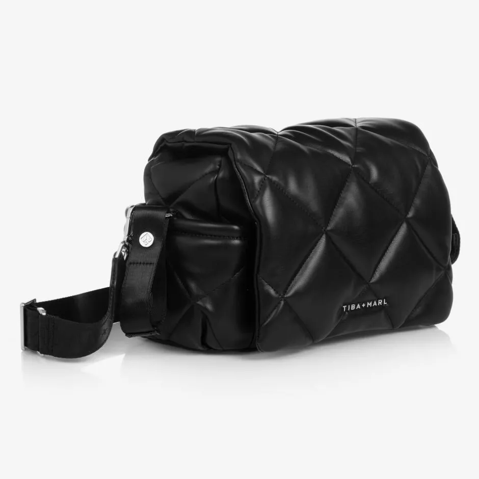 Black changing bag by TIBA & MARL, made in soft quilted faux leather. The main compartment has an internal pocket and an insulated bottle holder. It fastens with a popper on an internal strap and a popper on the flap. There are multiple external pockets, attached stroller straps and a detachable, adjustable shoulder or cross-body strap. This compact bag has a silver metal logo on the front and comes with a padded changing mat.